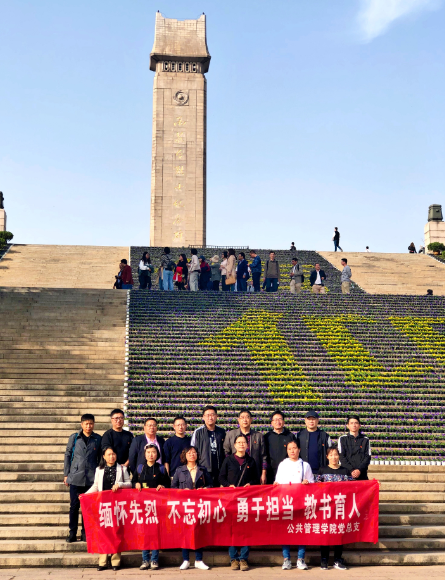 10月30日下午,公共管理学院党总支组织全体教师赴雨花台烈士陵园开展现场学习,此次学习主题为“缅怀先烈 不忘初心 勇于担当 教书育人”,紧密围绕“不忘初心 牢记使命”的主题教育开展,鼓励教师在自己的工作岗位上做好教书育人,做到勇于担当。