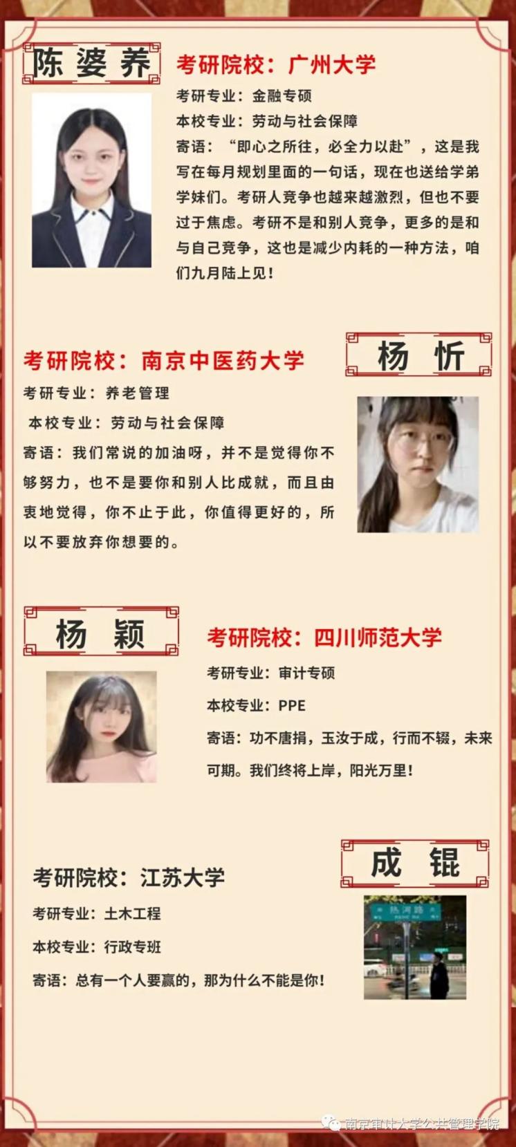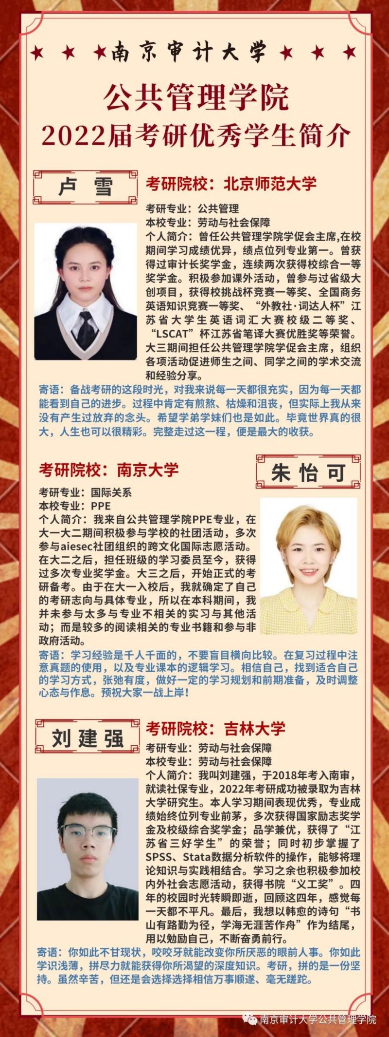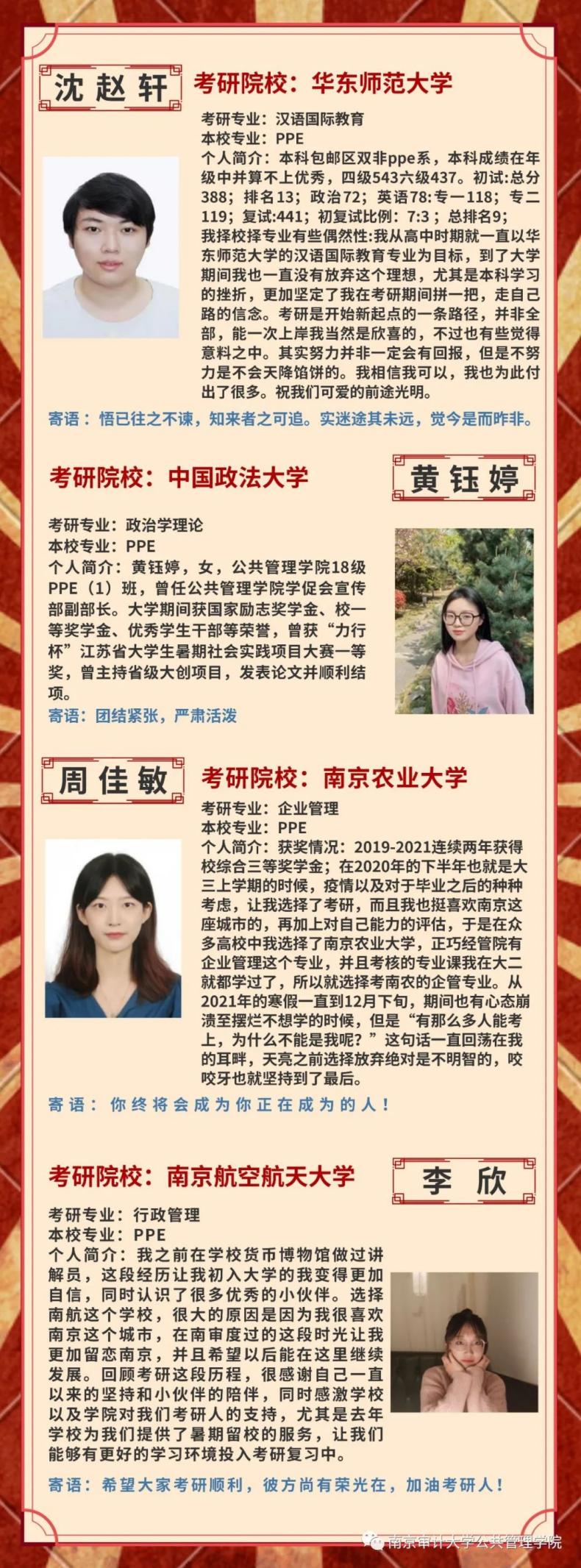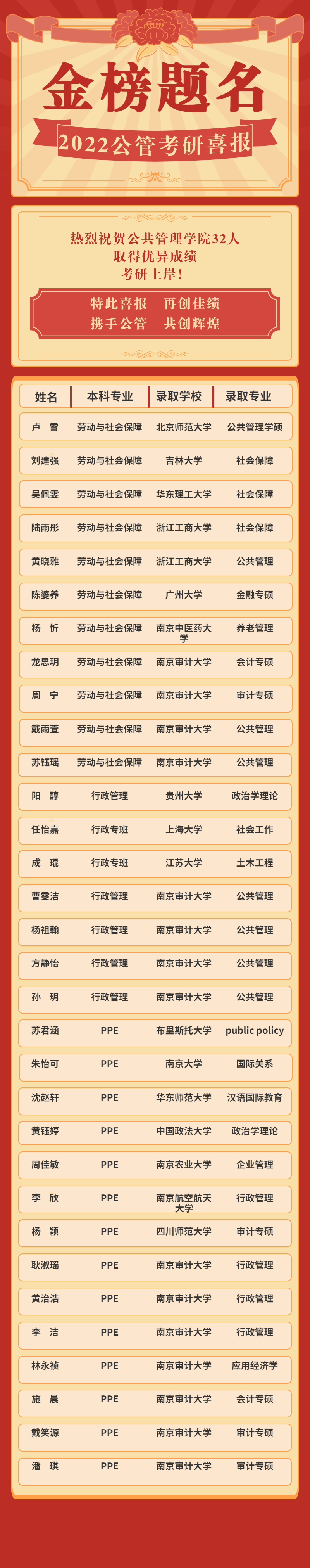 今年公共管理学院共有32名应届毕业生顺利通过研究生考试,其中共有10名同学成功被985和211名校录取,包括北京师范大学、南京大学、吉林大学、华东师范大学、中国政法大学、南京农业大学和南京航空航天大学等。除此之外,还有一名同学获得出国留学的资格。