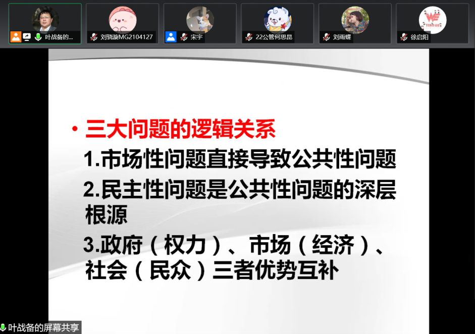 随后,叶战备教授对公共管理的改革性问题、市场性问题、公平性问题和民主性问题四项问题进行详解。他指出:市场性问题直接导致公共性问题,民主性问题则是导致公共性问题的深层根源,而寻求政府(权力)、市场(经济)、社会(民众)三者优势互补才是公共管理改革的最优解。