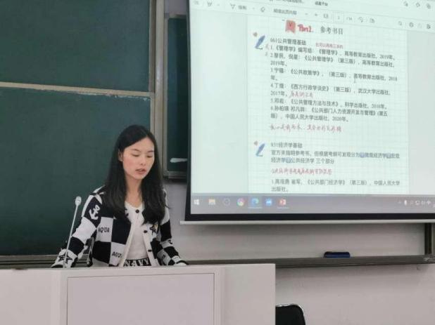 会议伊始,2018级曹雯洁、2019级赵伊玲与同学们分享了公共管理学硕的备考经验。其中包括目标院校与专业参考书目的选择、网课选择、资料挑选、学习规划、学习方法、考研心态的调整等多个方面,同时也分享了她们在备考期间的心得体会。