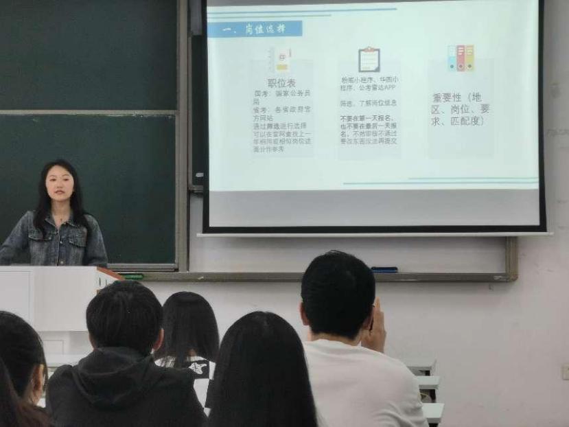 接着,2019级张冰冰学姐从个人考公经验出发,详细介绍了公务员考试的岗位选择、笔试经验以及面试经验,从心态调整、考公题型、网课选择、时间分配等方面提供了实用备考建议。