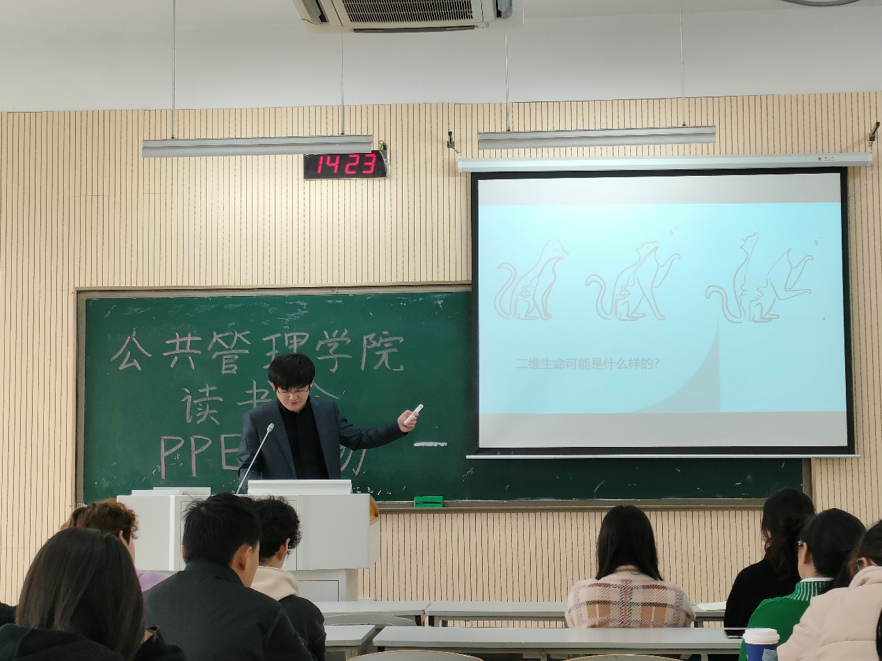 2023年11月22日下午14:00,由电影天堂 公共管理学院学生会主办的读书会以线下形式顺利展开,本次读书会主要面向PPE专业的学生,诚邀公共管理学院武天欣老师分享《时间起源》一书。本次活动意在指引同学们在新环境展望未来,同时,希望同学们在未来作出决定时能够学会更加周全地思考,促进自身的发展。