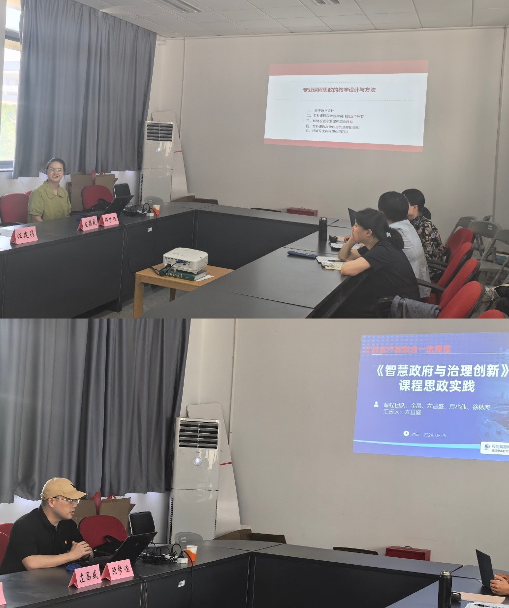 随后,公共管理学院实验教学中心主任左昌盛老师从自己所教授的《智慧政府与治理创新》的课程出发,从“学·训·赛”等不同角度,分享了自身思政内容融入实践课程的经验;如在实践要求学生自主搜集相关时政新闻内容,实践中加以运用,实践后积极总结,认真研习,深入挖掘课程思政元素等。